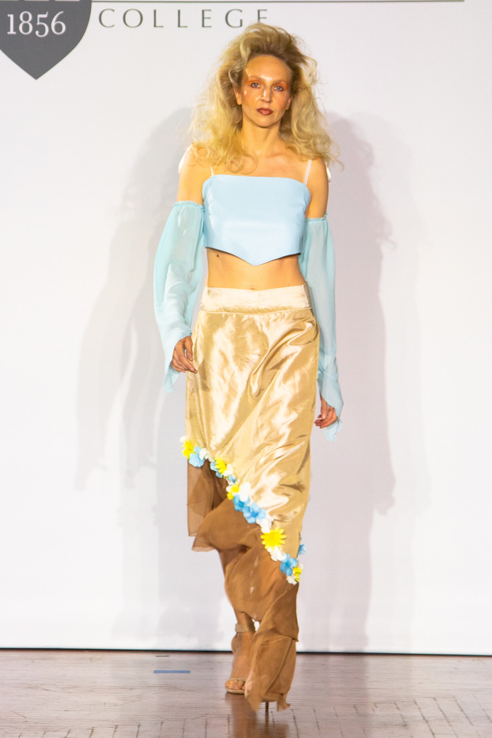 Mary Quinn, from Milford, Pennsylvania, was first up. Her designs were floral, tiered & rendered in pretty Easter Egg pastels such as Yellow, Blue, Lavender, & Pink. Her strongest look was a halter neck party dress composed of layers of semi sheer ruffles in the pretty pastels just cited. The dress hit just above the knee & would be perfect for a summer patio & pool party. The pretty pale Yellow long sleeve crop top & matching long ballgown skirt embroidered with daffodils is ideal for a romantic mid-summer garden party. The model in big eighties style hair by Jorge Luis, reminded us of the big, bigger, biggest hair women wore in the night clubs of the day.