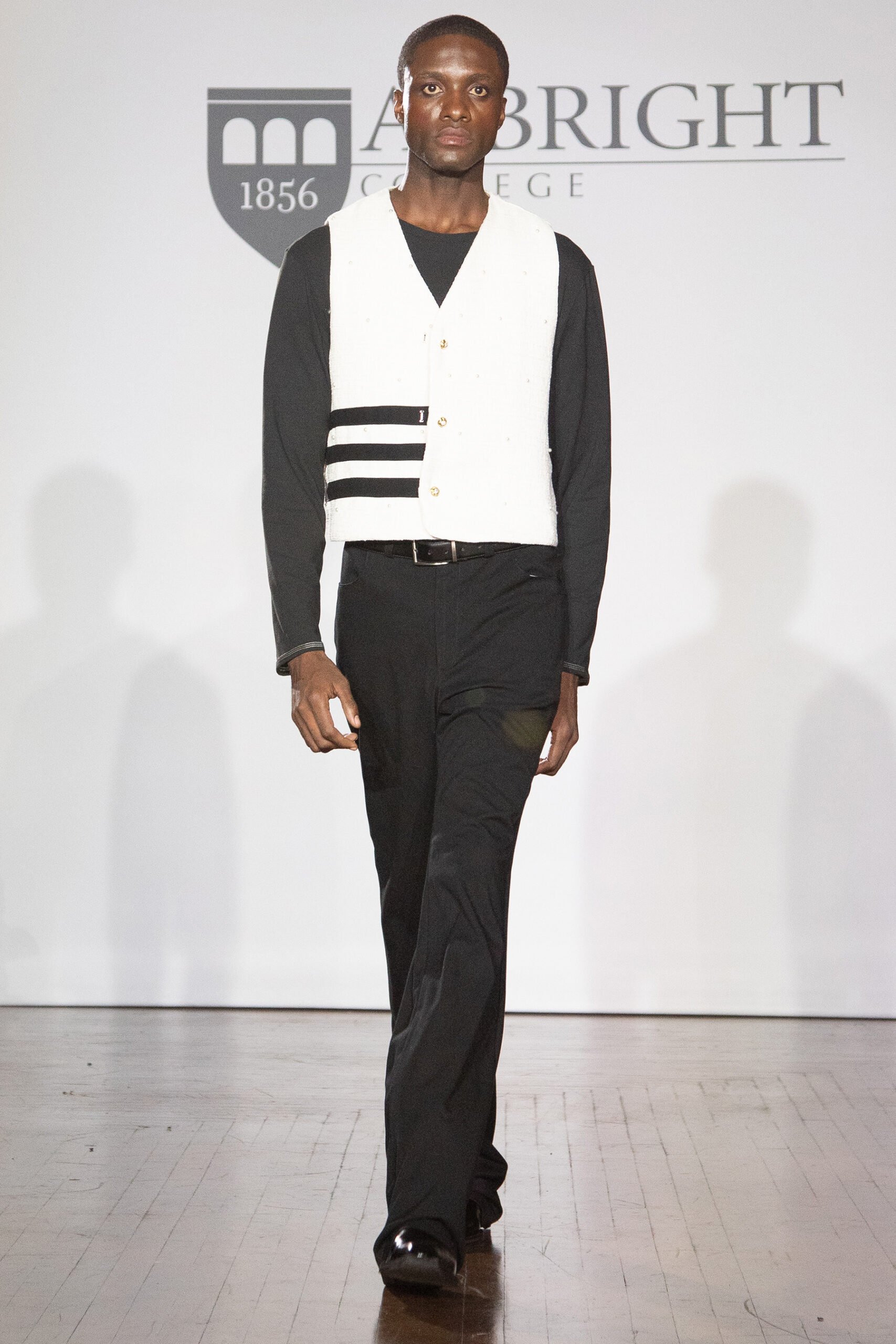 Truc Phuong Ha, also from Reading, showed her prowess at delivering effortless minimalism with an edge that saved it from being ho-hum. Her standout outfit was a long sleeve black shirt & slim trousers & white vest that played neatly into fashion’s continued fascination with androgyny. The edge came via 3 vertical black bands on the vest.