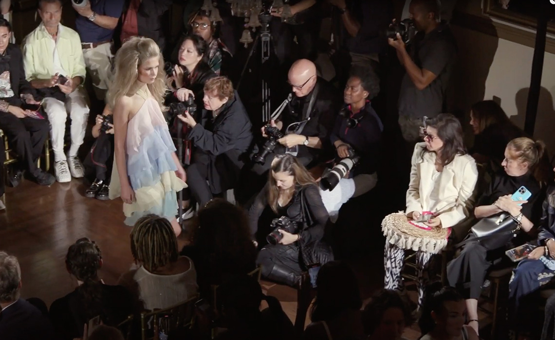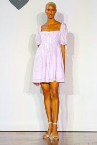 Abby Thomas-Ridgway focused on pretty day dressing. She delivered airy little sun dresses that gave the illusion of floating off the models’ bodies. The White empire dress with Pale Pink satin trim along the neck & busty lines with a bow applique got our vote for vest summer day dress. The long dresses reminded us of the seventies’ brand, Gunne Sax, (owned by designer Jessica McClintock) that was the go-to brand for formal & semi-formal wear for high school & college girls back then.
