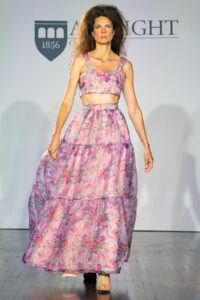 Mia Rezza, a Horscham, PA resident, is a designer who has a promising future as an eveningwear designer. Her long pale satin designs were well-fitted, an absolute necessity when designing with satin. The Champagne halter neck satin gown was beautifully juxtaposed with the tiered Baby Blue Flamenco style tulle skirt.