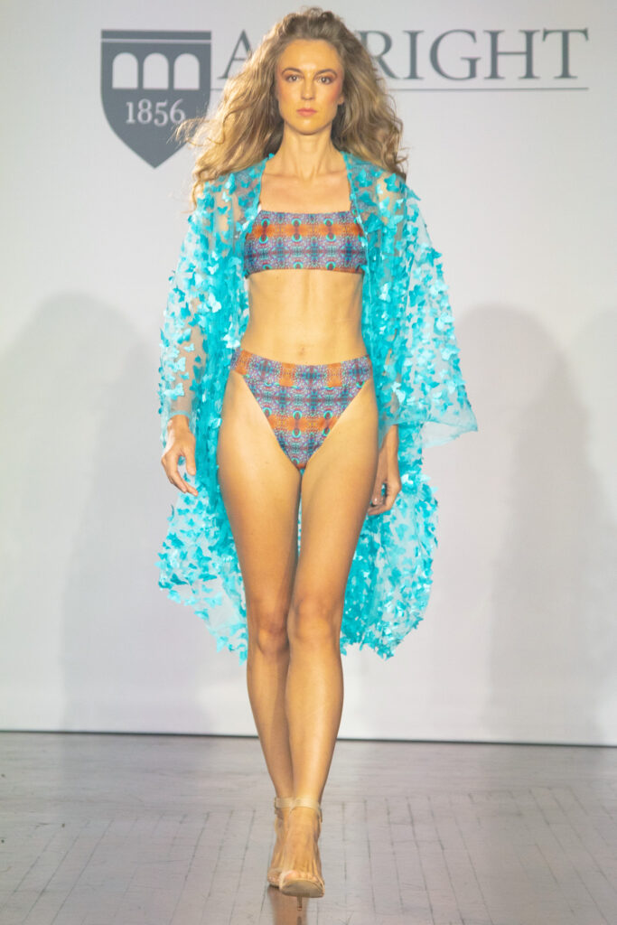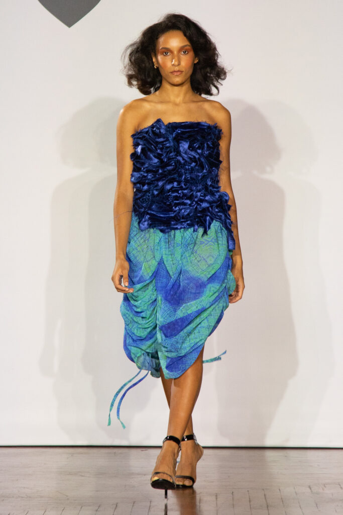 Returning designer, Stephanie Vargas Hemmings, closed the show with a bang. Her Champagne & Yellow Chinoiserie vest looked good with the asymmetric mini she showed with it & could also work as a going out to drinks top paired with jeans. A great day look was a Cobalt Blue asymmetric one shoulder top shown with billowing Cream high waisted pants. Best though was the Cobalt & Turquoise fold over bra top with skinny gold hardware straps & matching sheer palazzo pants that could go from poolside to dinner in Miami.