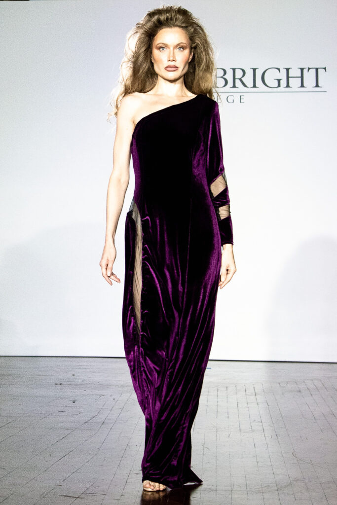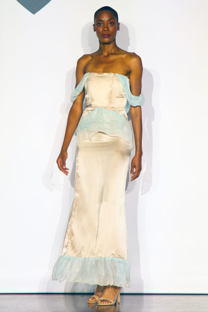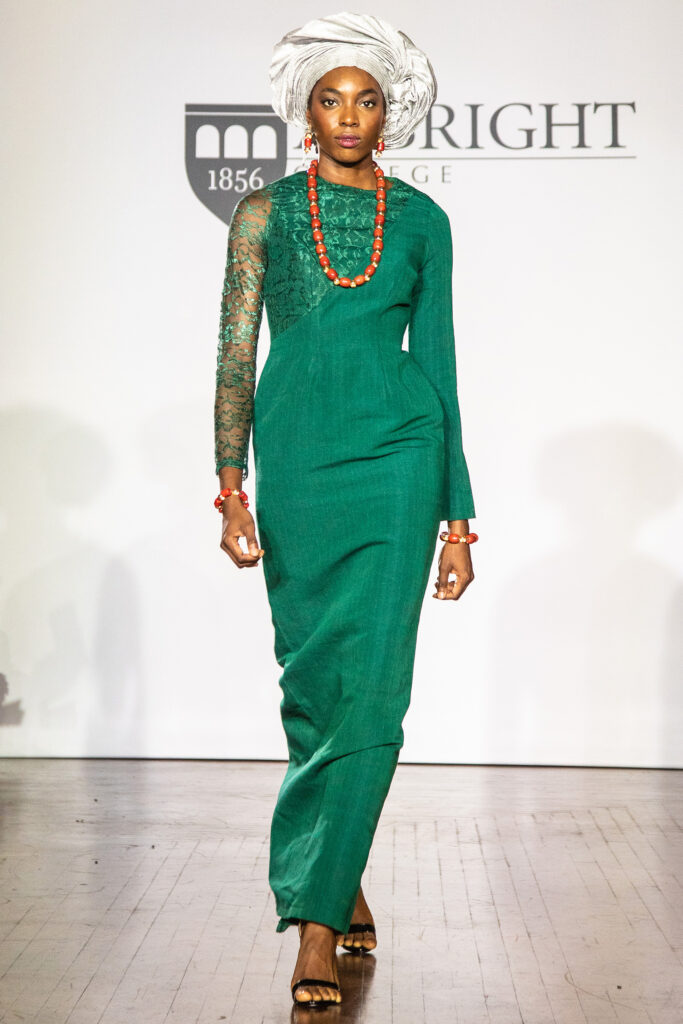 Felicia Oyekola, kicked off the dressier second half of the show. She touched on the season’s deep jewel tone colors, showing a Garnet Red long dress, followed by a deep Emerald Green gown with an interesting sheer detailing on one sleeve. Both would be ideal for a cocktail party or as bridesmaid dresses.