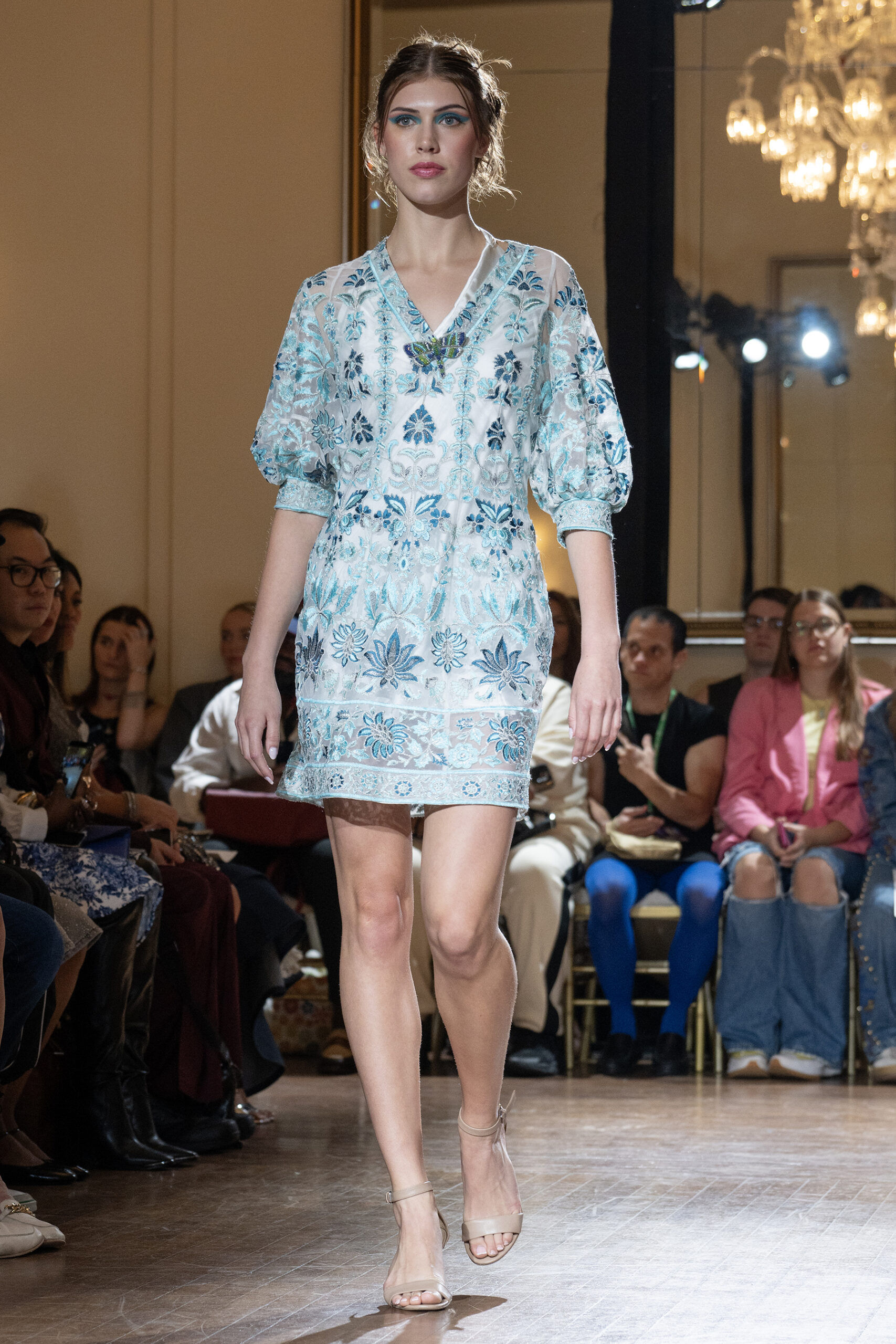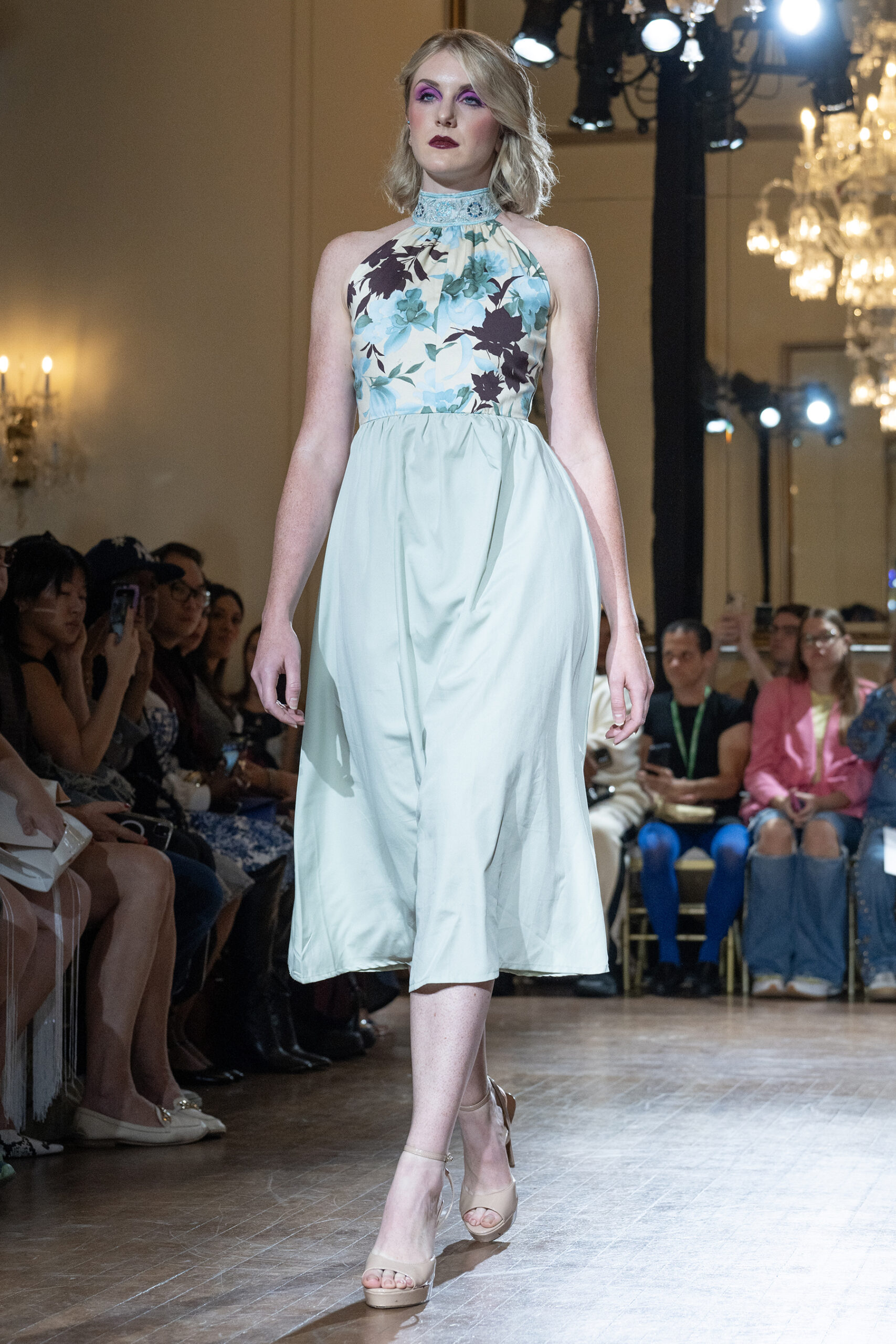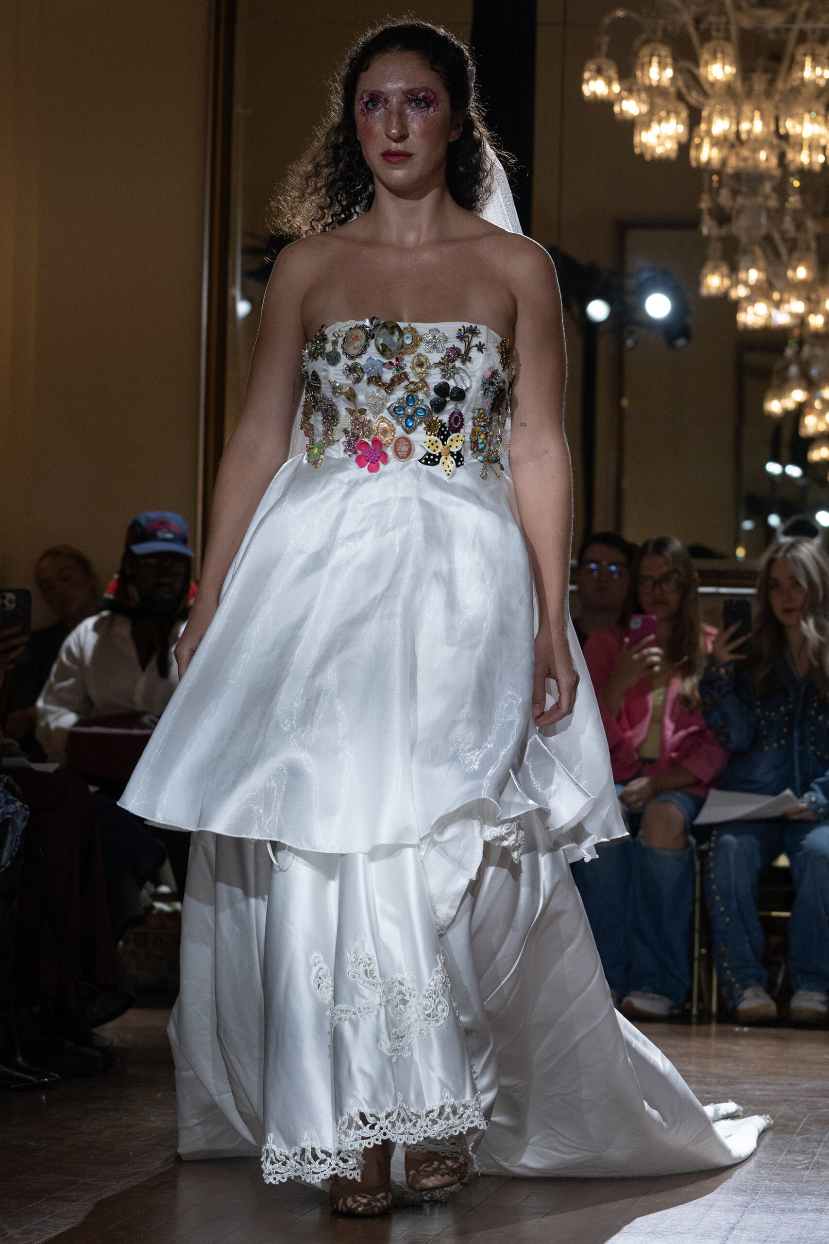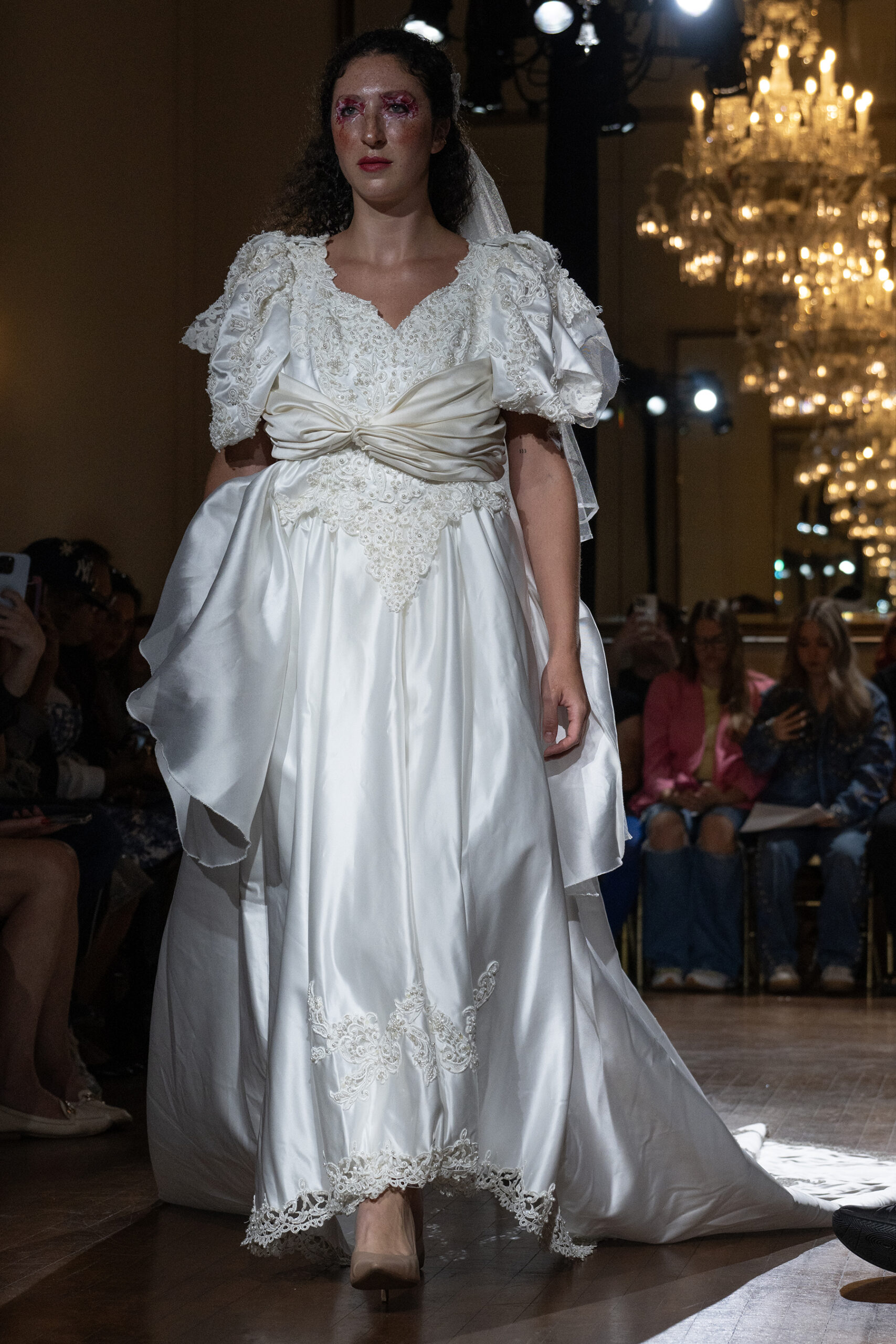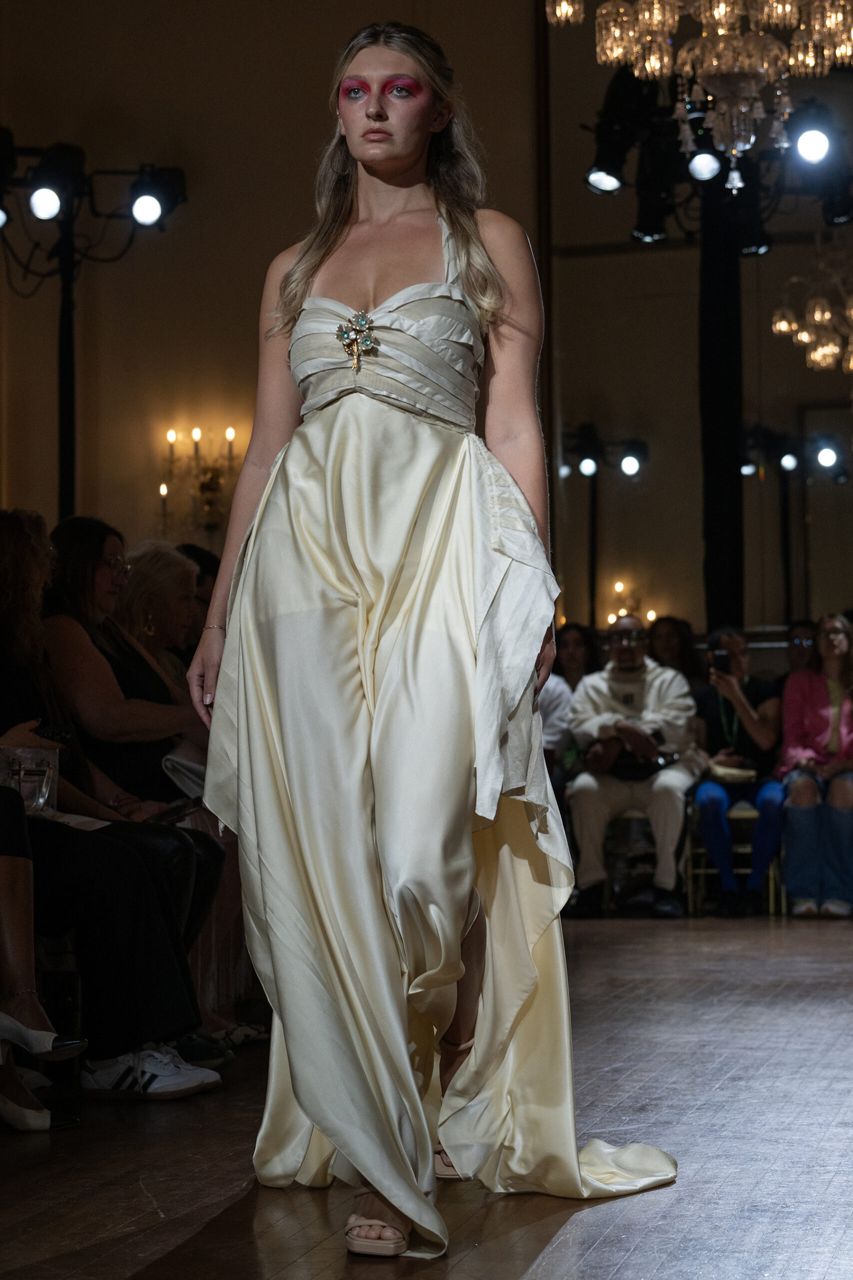 It wouldn’t be an Evan Hirsch show though, without some transformation dresses, like the Gold poncho that revealed a Hot Pink layered mini dress, and the bridal finale gown. Having a wedding gown as the finale piece, brought some of the magic of the legendary European shows in the eighties by the likes of Karl Lagerfeld and Vivienne Westwood. Evan checked all the boxes – a grand silhouette, dramatic sleeves, and plenty of lace and beading accents, and in this case, a brooch-encrusted bodice. The proceeds from the sale of these one-of-a-kind pieces will support Goodwill’s mission-driven workforce development programs nationwide.