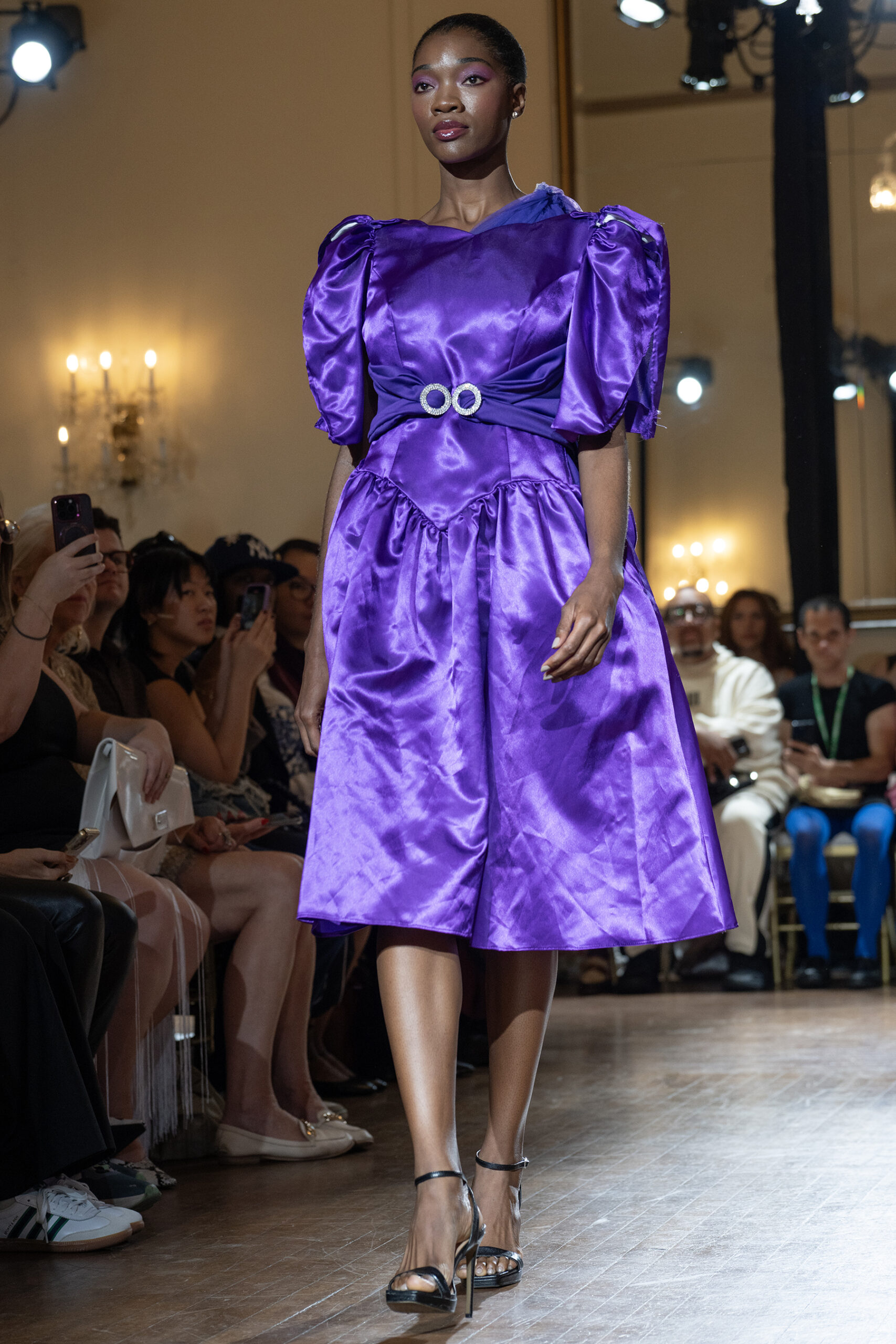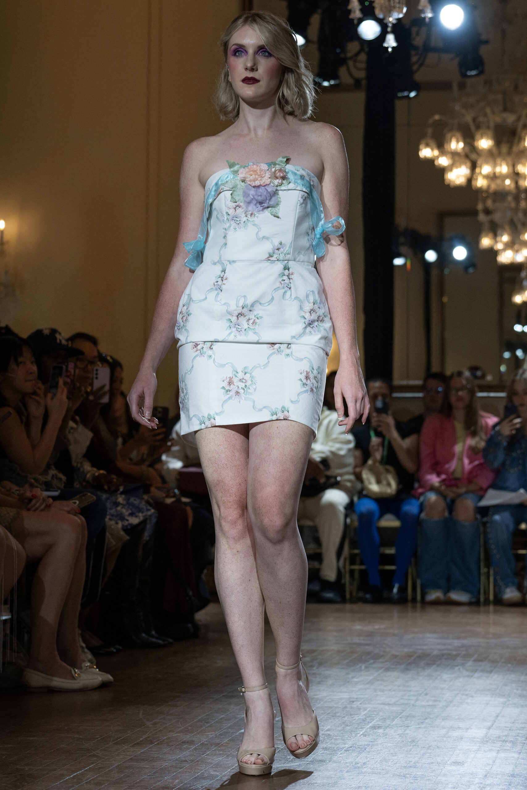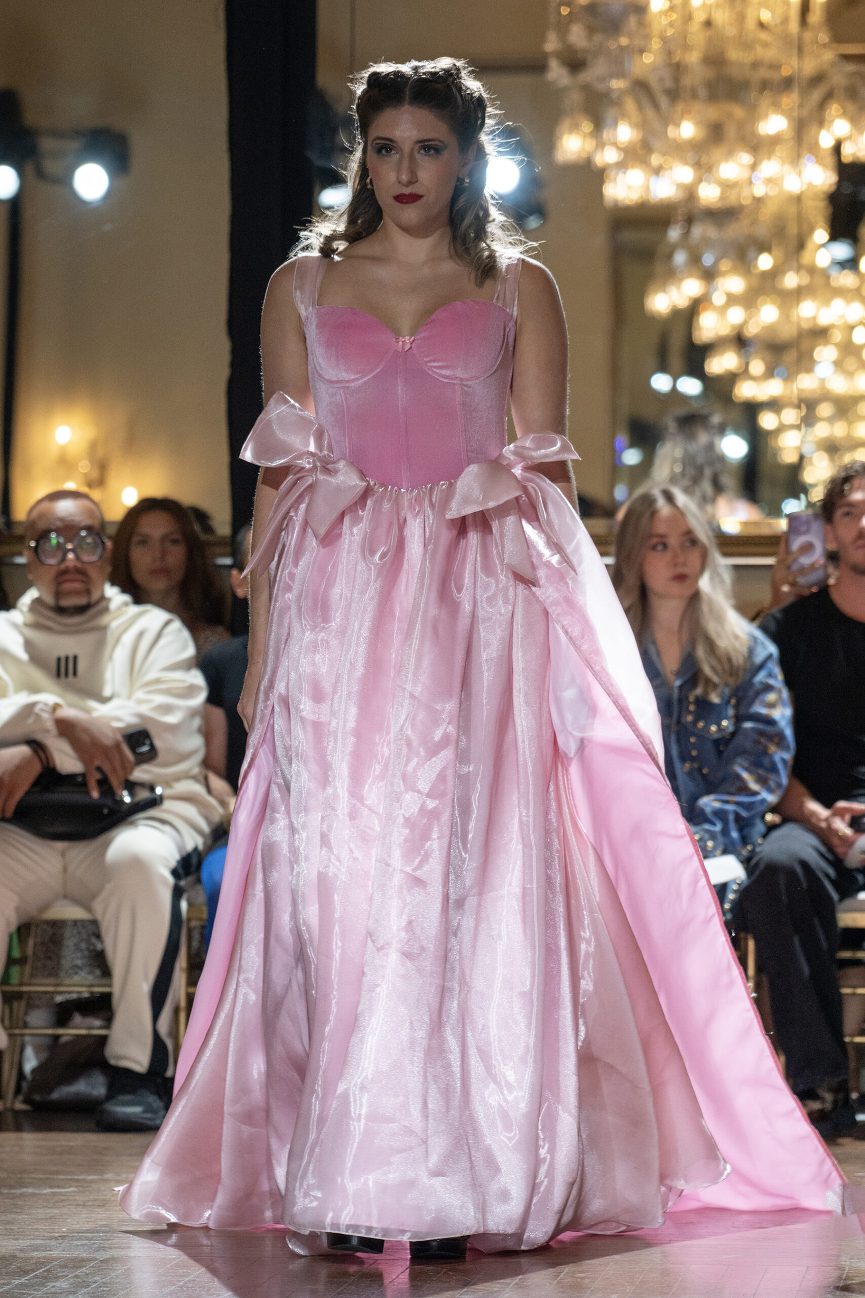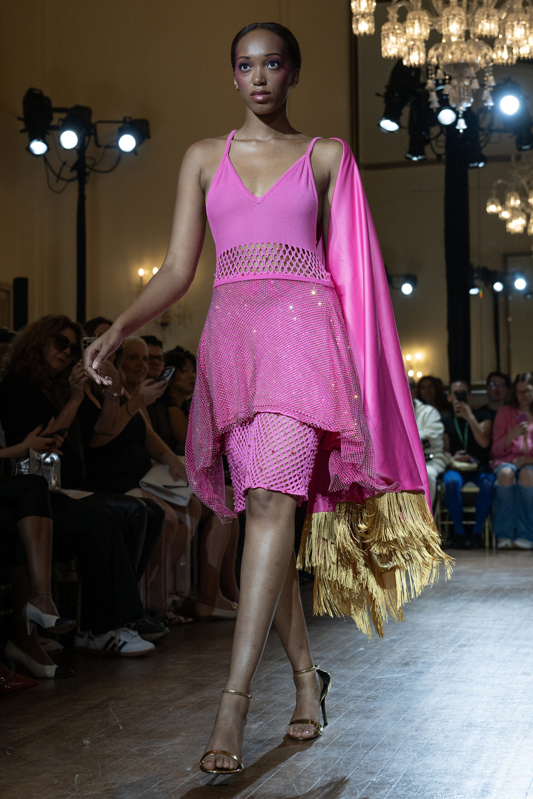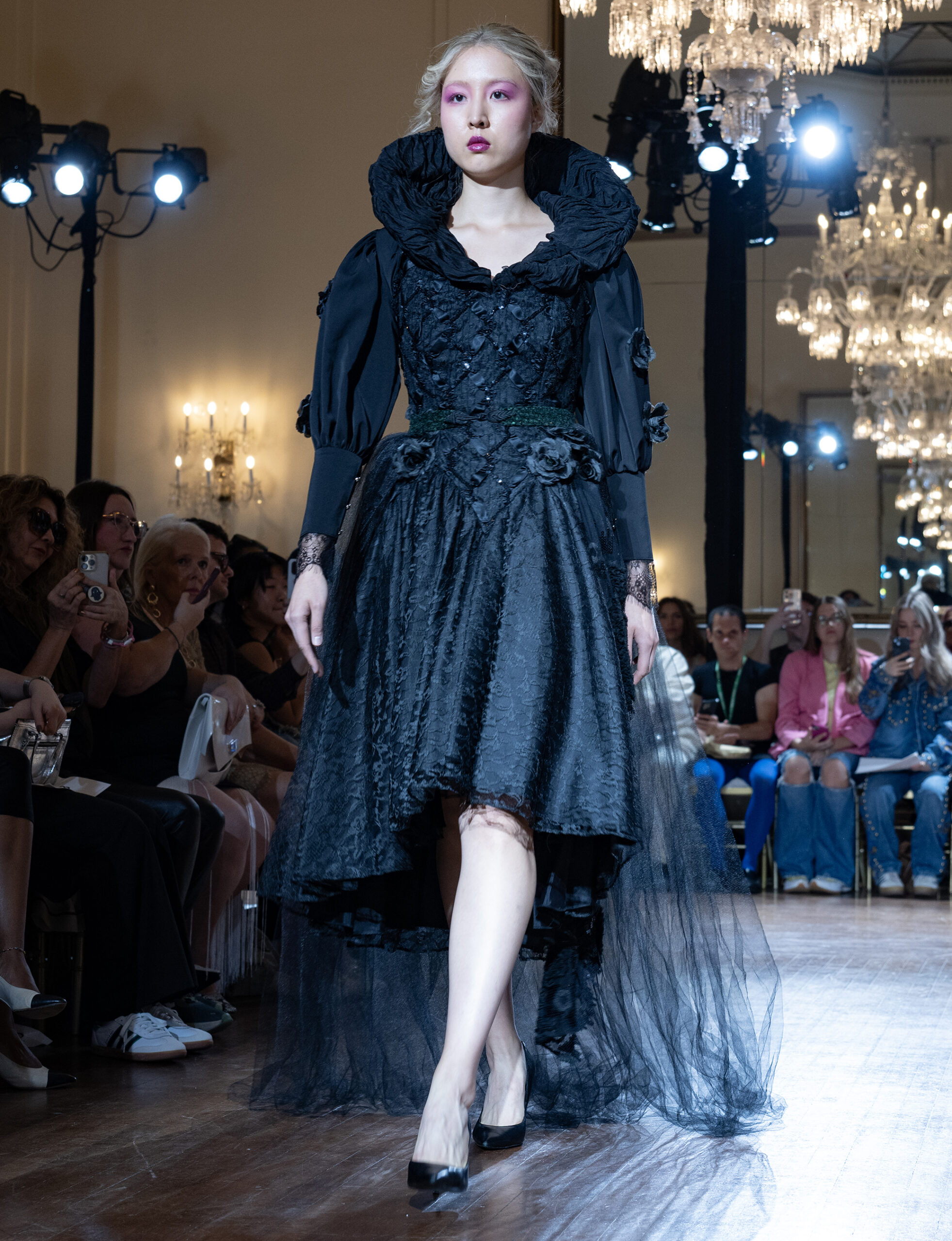 While he showed some convertible pieces that are the genesis of his career as a NYFW designer, (and they’re always a crowd pleaser,) he flexed his design muscle and proved the 17th century proverb, “You can’t make a silk purse out of a sow’s ear” wrong. Evan demonstrated that it is in fact possible to make something of high value from items that are regarded as inferior. Take his voluminous Pink ball gown that resembled “Princess Aurora’s” gown put together by her Fairy Godmothers in the Disney version of Sleeping Beauty. Like the rags Flora, Fauna and Merryweather started with, Evan’s gown started its life as an inexpensive Halloween costume.