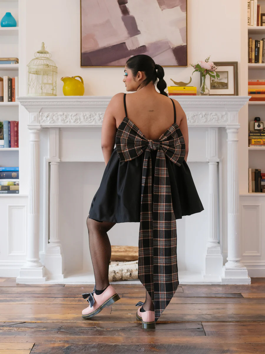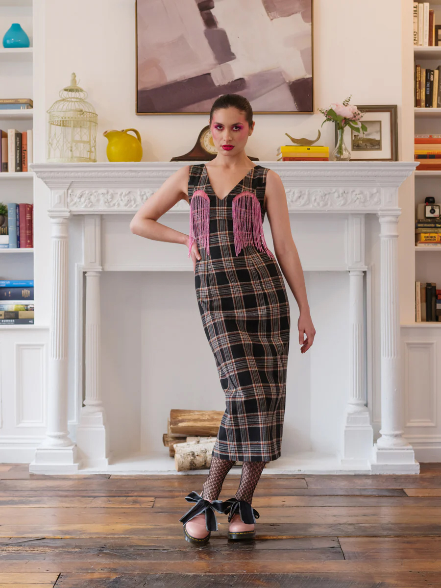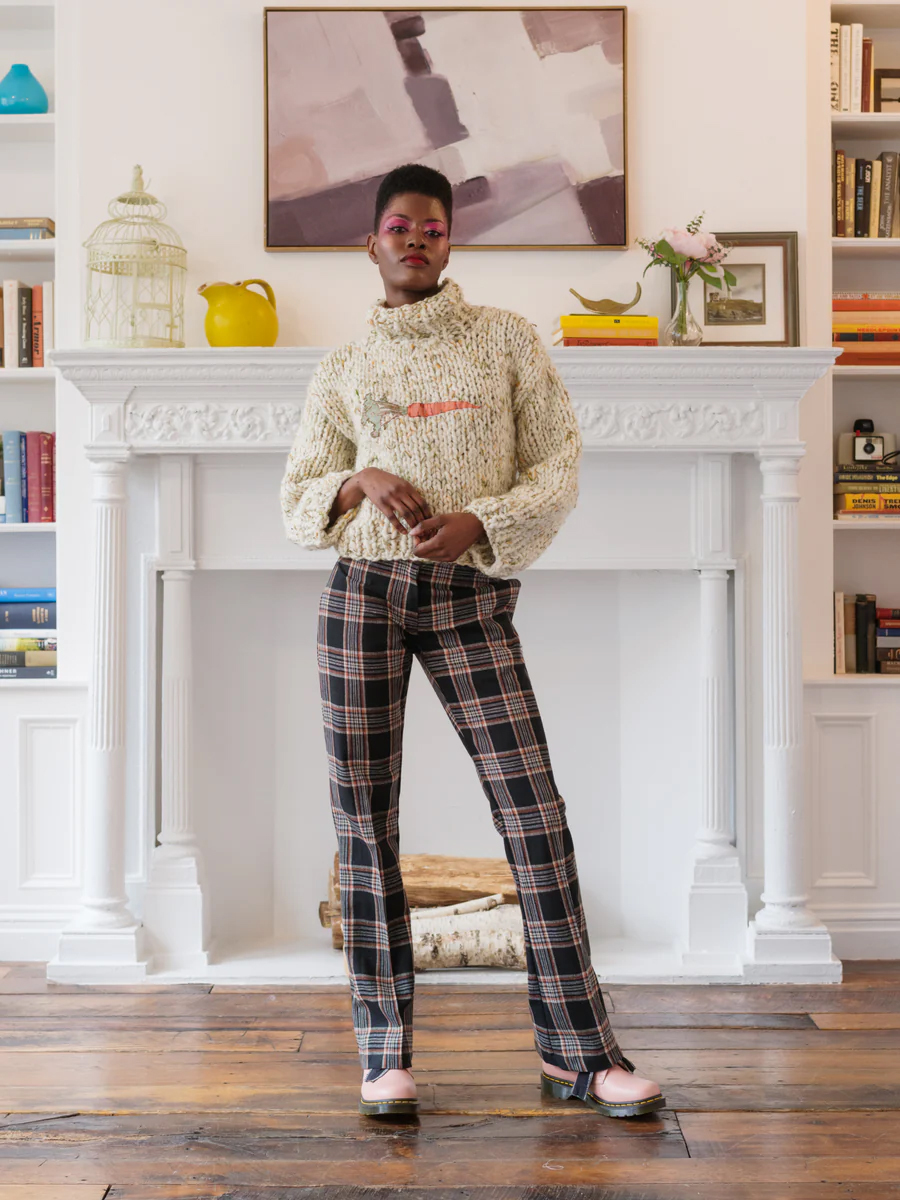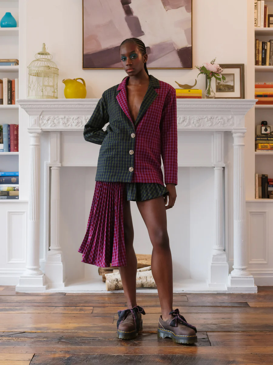 We stepped of the elevator eager to view designer Emma Gage’s buzzy MELKE AW 2024 presentation that was taking place on the 10th floor of Gary’s Loft, the location of hit movies such as “Begin Again” (2013), starting Keira Knightly & Marc Ruffalo. Upon entering, one of the models immediately invited us to a scavenger hunt to find the clues to “find the cheese”, that rested inside a glass dome held by another of the models on the other side of the loft. She was dressed in a wide lapel Green & Navy check jacket accessorized with a Pink choker, on which hung plastic balls & small chunks of Yellowmake-believe cheese – right in line with the collection’s theme, “The Heist”.