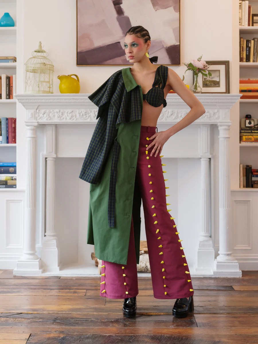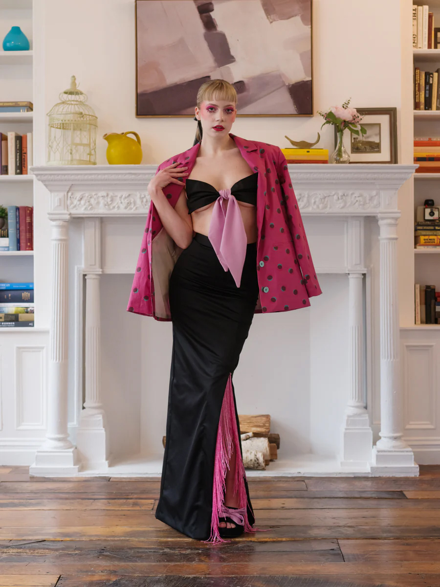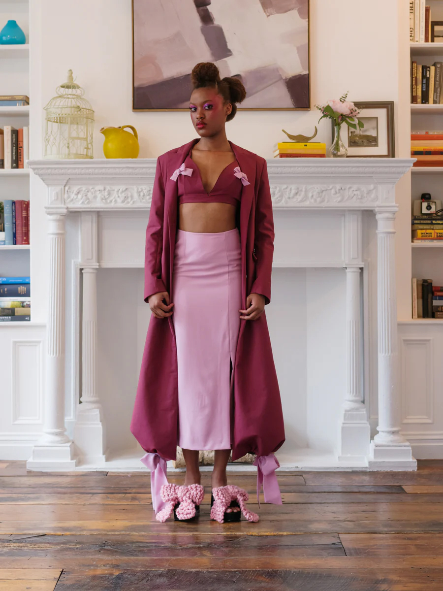 As for the designer, Emma Gage is the two-time winner of the YMA Fashion Scholarship & the Kate Spade & Company Scholarship. Her aesthetic is a marriage of genderfluidity & slow fashion. Her website (www.melkenyc.com) describes her aesthetic as follows. “Her uniquely unapologetically exuberant vision (consists) of seriously unhinged luxury collectibles with unrestrained love for the planet and its people.”