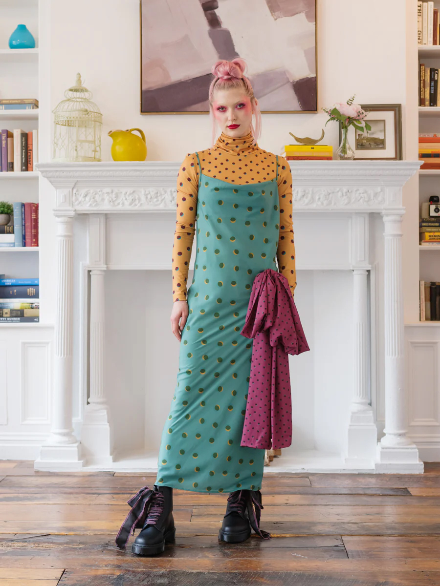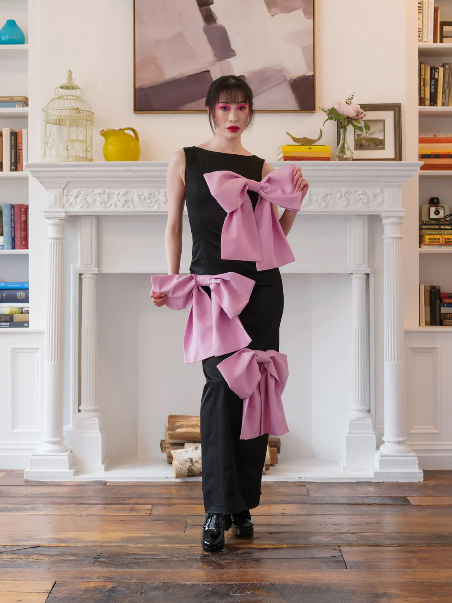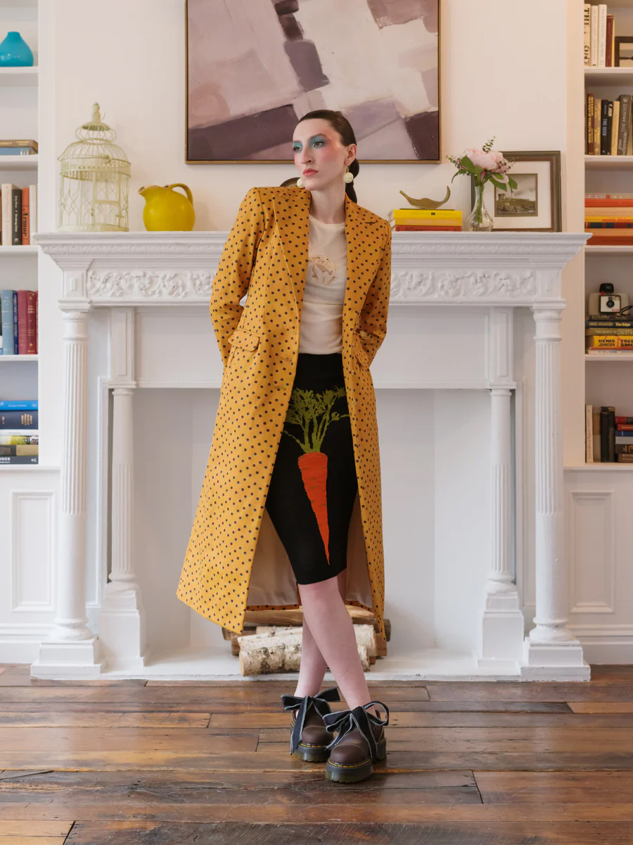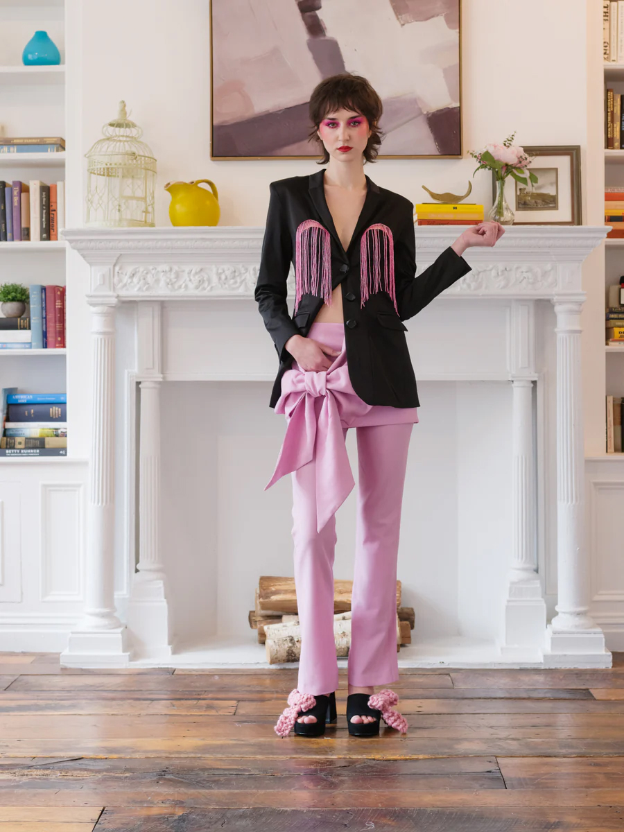 As for the designer, Emma Gage is the two-time winner of the YMA Fashion Scholarship & the Kate Spade & Company Scholarship. Her aesthetic is a marriage of genderfluidity & slow fashion. Her website (www.melkenyc.com) describes her aesthetic as follows. “Her uniquely unapologetically exuberant vision (consists) of seriously unhinged luxury collectibles with unrestrained love for the planet and its people.”