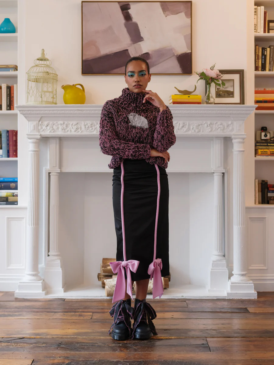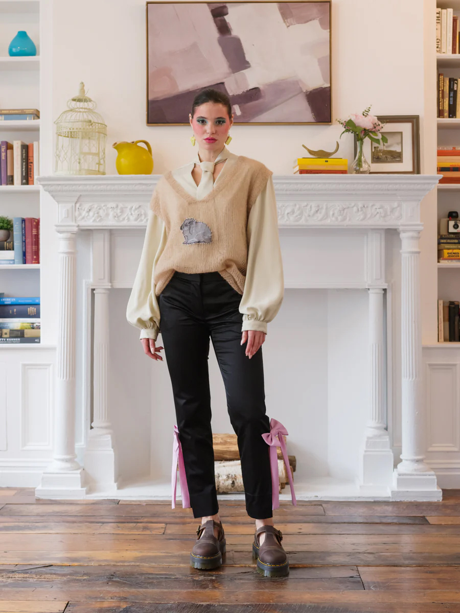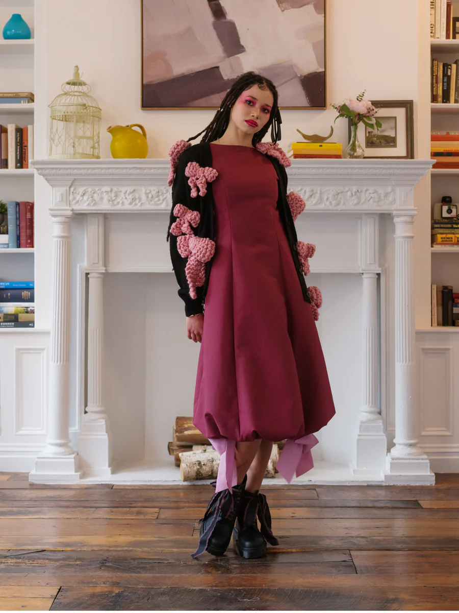 In the cardplaying vignette, a model wore a Cream blouse with voluminous Russian Cossack sleeves with a matching wide necktie worn & Oatmeal men’s wool vest, softened by a side slit black skirt tied at the knee with a pretty Pink bow. By contrast, the cardplayer’s companion wore a flowing Teal coat with wide legged Pink & Red windowpane trousers. While the cut of the coat was masculine, the soft color feminized it. The most overtly feminine look was modeled by a pixie haired mode positioned next to the cheese prize, wearing a Black jacket accessorized with Pink beads positioned on the nipples & a pretty pair of Pink pants tied with an oversized pussy cat bow. The Pink bow also found its way on her companion’s Black jacket, this time in the form of large Pink hand crocheted bows accessorizing the front & back of her shorter jacket. All the looks were grounded with heavy unisex Doc Martens footwear.