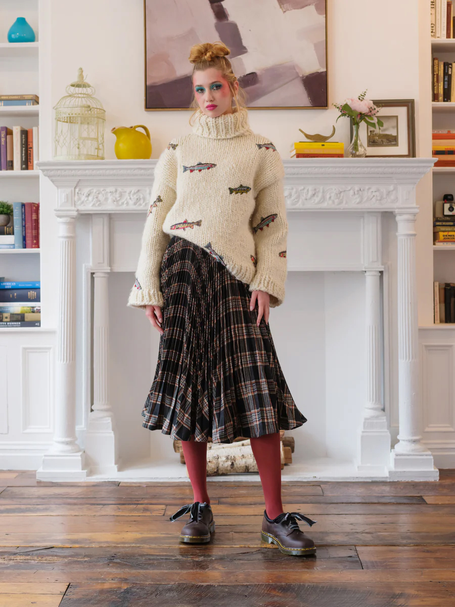 The presentation was broken down into seven vignettes, some featuring a single model, (our guide/hostess referenced above), & some a grouping of 2 or 3 engaged in a homey activity such as card playing, ironing, reading or knitting. Lest this sound boring, it was not. Stylist Cara Benevenia, hair lead Britt Dion & Michelle Webb & her team at Aveda did a bang-up job styling the models & giving them dramatic Pink & Teal eye makeup & messy updos. The models looked cartoon & period appropriate, as if they belonged on the streets of Wignan, relaxing at home after a long shift working at the mills. A few of the models were bundled up against the cold, in Gage’s take on the classic Irish fisherman sweater paired with long plaid skirts or trousers.