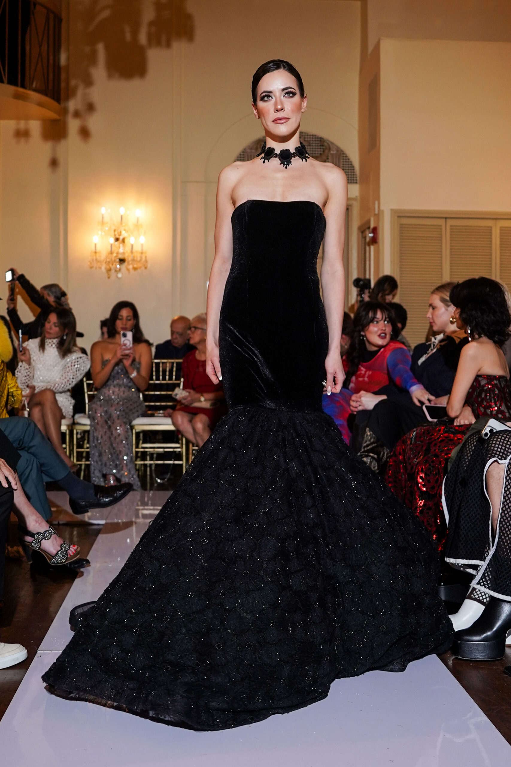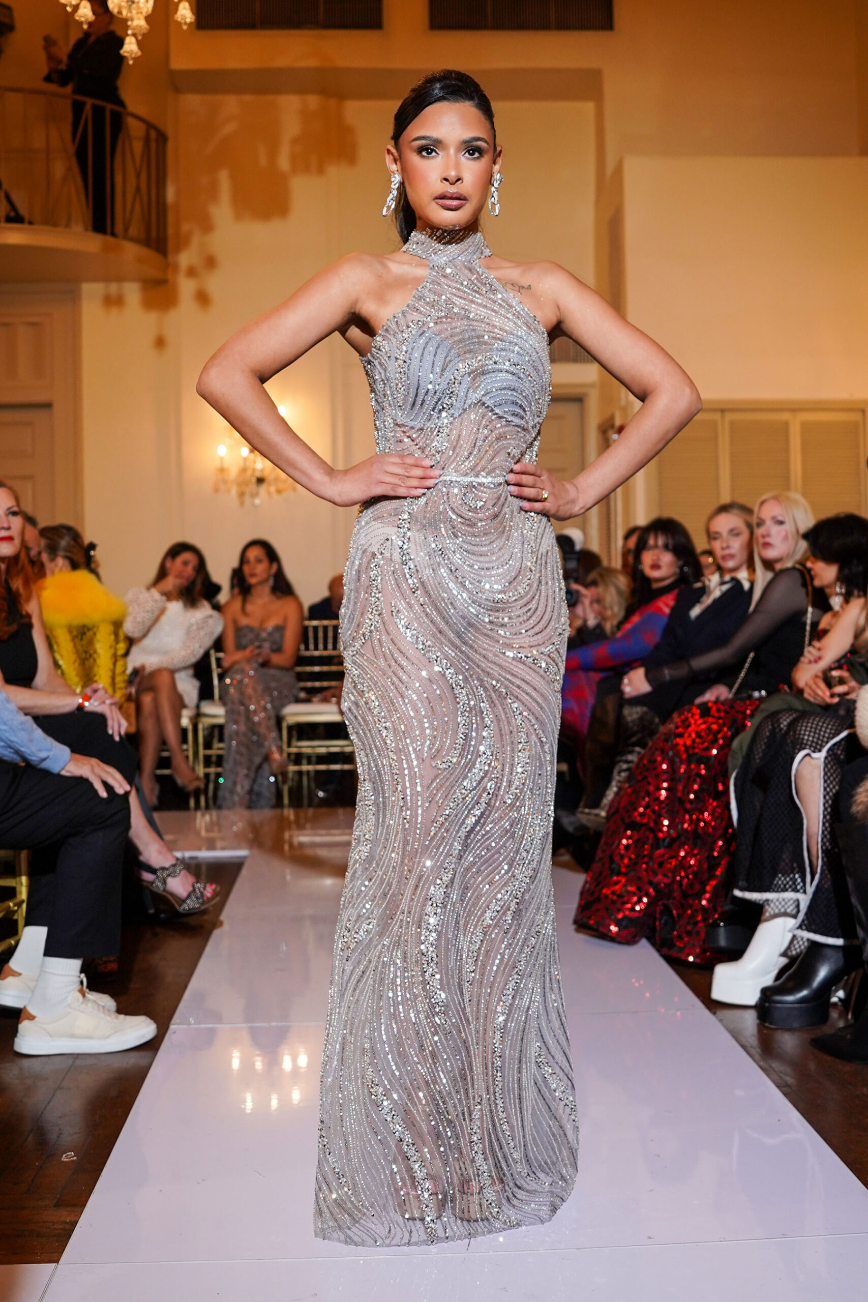 From scanning the front row, it was evident that Diana Mahrach Couture is a go-to for pageant dressing, no question. Beauty pageant celebrities who favor Diana’s designs include Sthefany Gutierrez who was Miss Venezuela 2017. One of the show’s highlights was when a mini beauty pageant contestant strutted out on the catwalk. She posed & mugged for the cameras in a pale Peach gown complete with a floral tiara & big pageant bow affixed to her right shoulder.