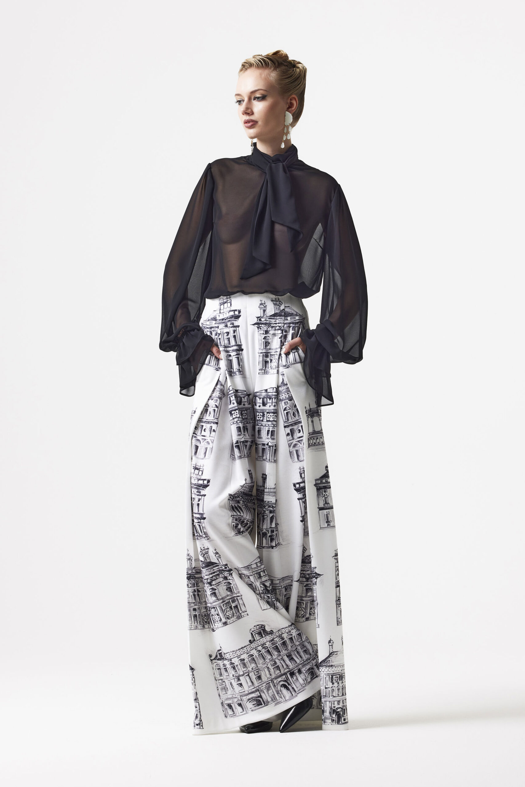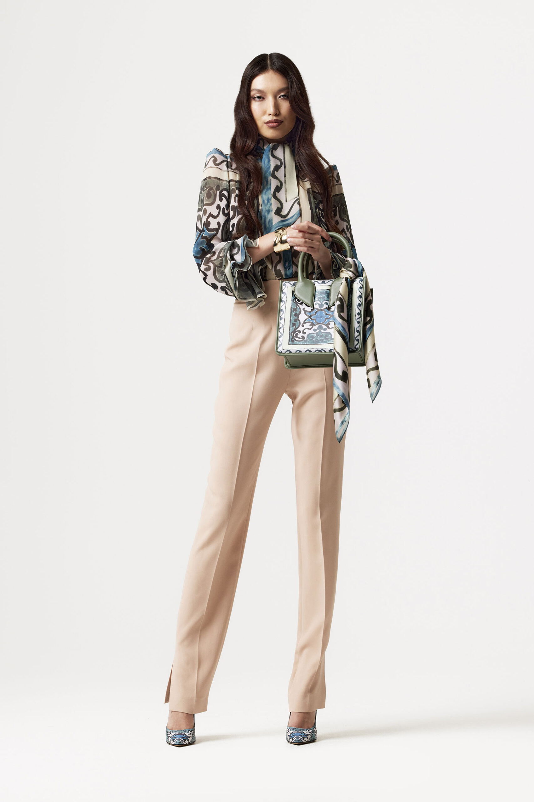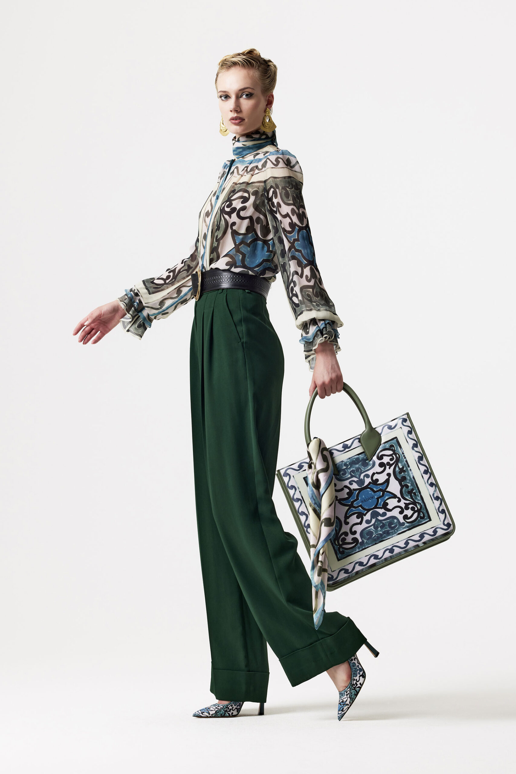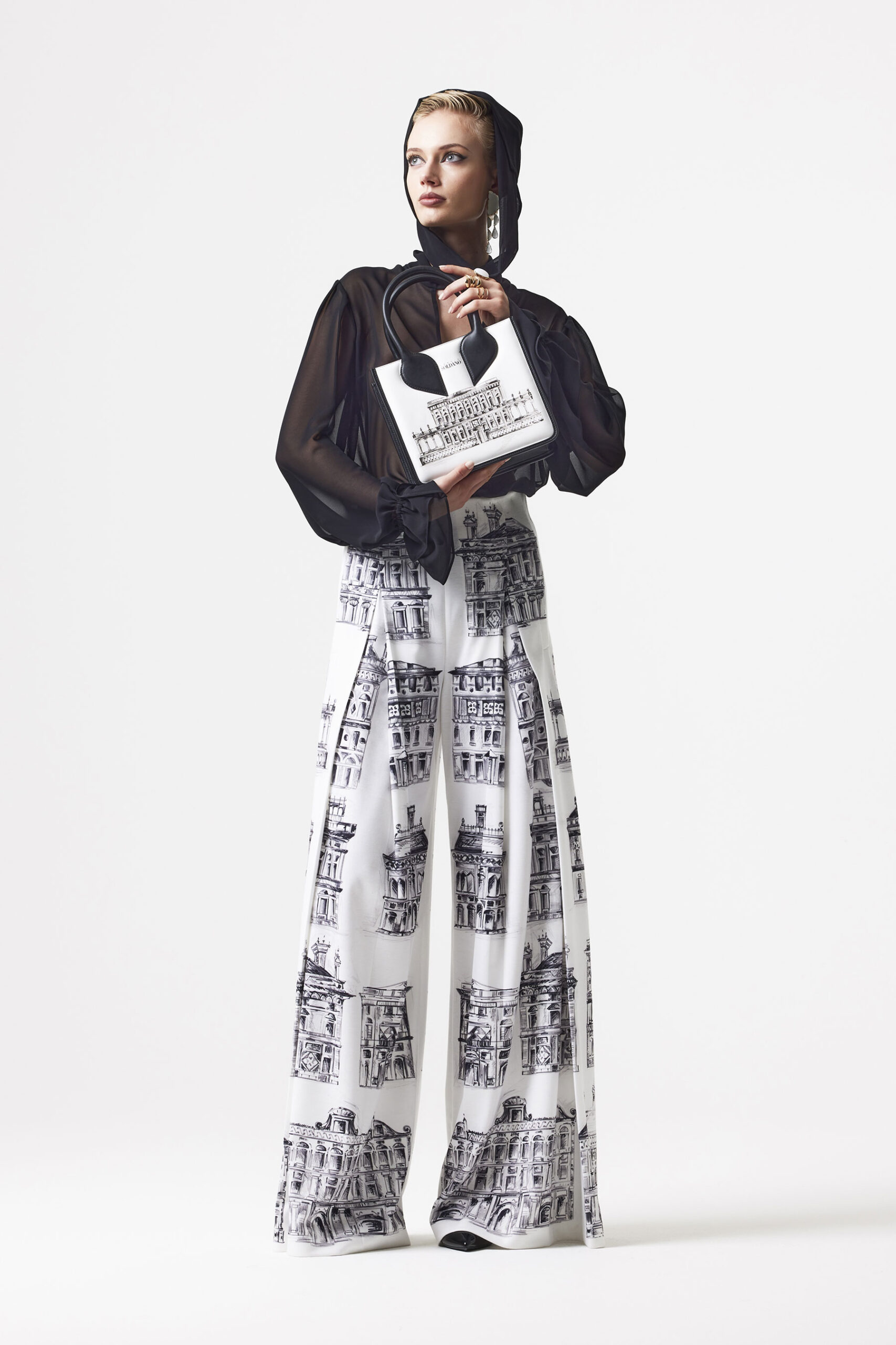 Under the direction of co-creative directors Giovanni Premoli and Dario Di Bella, the 107-piece offering signaled not nostalgia, but intention. Rather than mining the archives for retro silhouettes, the designers approached Soldano’s legacy as what Premoli described to us as “a living visual language.” Prints — some originating as oil paintings on canvas before being transferred onto silk — carried the weight of memory without feeling referential. “It was never our intention to reference the past through literal forms,” Premoli noted. “Here, memory becomes vision.”