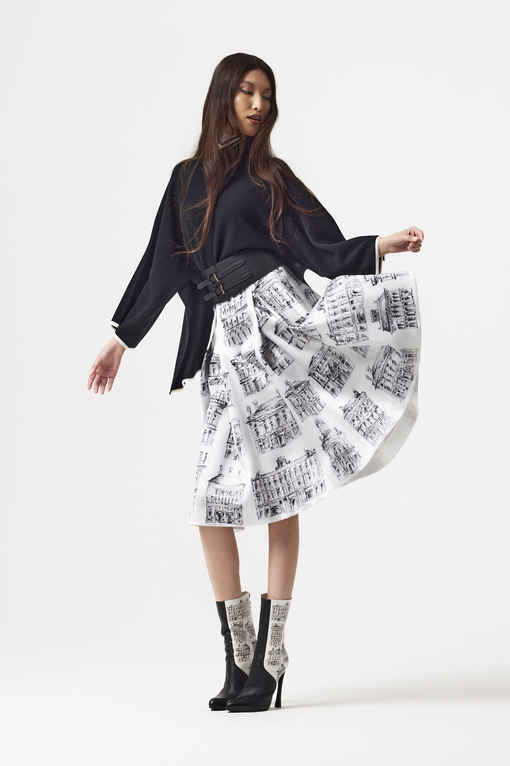 Presented in partnership with Fashion Group International, the Fall/Winter 2026–2027 collection unfolded inside Printemps’ second-floor Boudoir — an Art Deco jewel box of a space that lent itself beautifully to Soldano’s renewed point of view. Guests ascended the grand staircase into an environment that was part salon, part installation. Select looks hovered overhead. Others lined the perimeter like sculptural sentinels. At the center, models moved deliberately through a live artistic performance, transforming what could have been a static showroom into a living tableau of fashion.